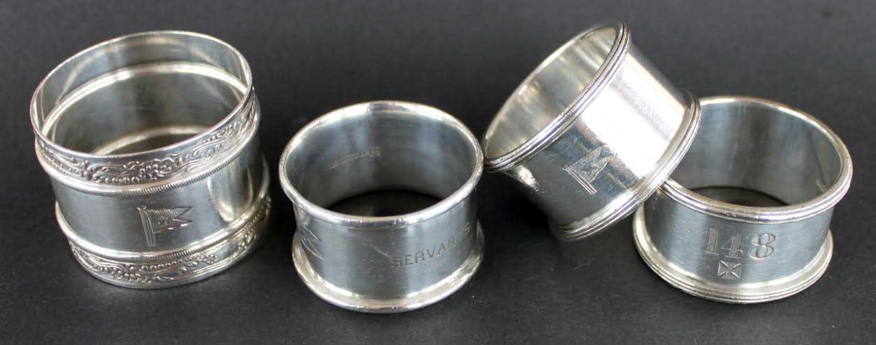 Above, for Titanic three distinct types of silver-plated napkin ring were designed. L-R - 1st Class pattern used in the Restaurant and Café Parisien, designed by Goldsmiths’ & Silversmiths’ Co. Ltd and part of their Regent Plate range. Servants were provided with a plain ring marked with the word ‘SERVANTS’ and manufactured by Elkington & Company. 1st/2nd Class passengers used the same design of ring again made by Elkington as part of their ‘Olympic’ pattern specially designed for the new ships, but the rings for 2nd Class carried a small Maltese cross for identification. Lastly a printed tissue napkin was provided for 3rd Class passengers.