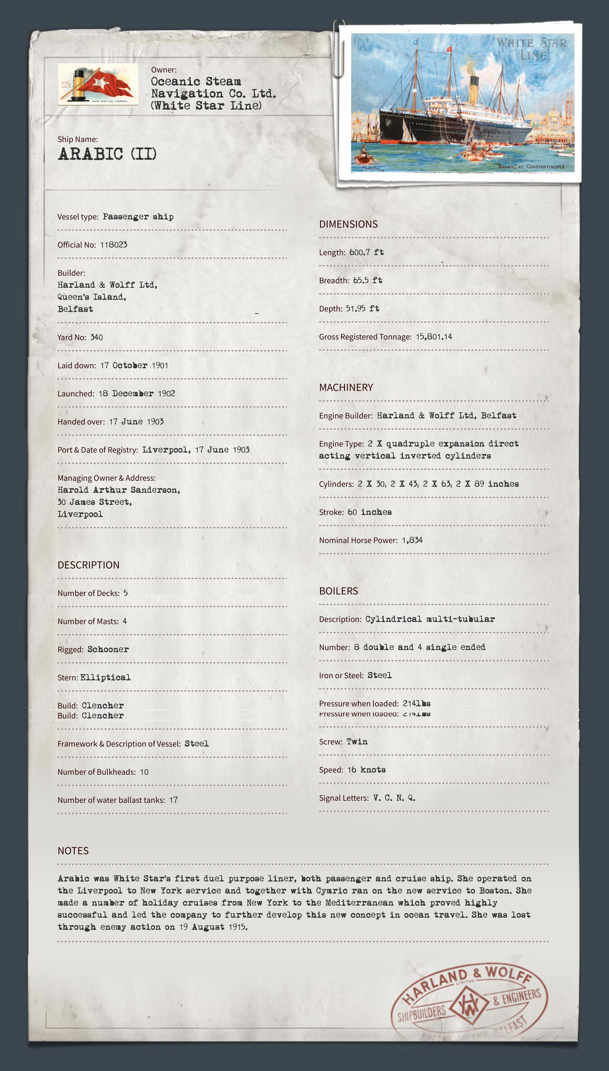 Arabic was White Star's first duel purpose liner, both passenger and cruise ship. She operated on the Liverpool to New York service and together with Cymric ran on the new service to Boston. She made a number of holiday cruises from New York to the Mediterranean which proved highly successful and led the company to further develop this new concept in ocean travel. She was lost through enemy action on 19 August 1915.