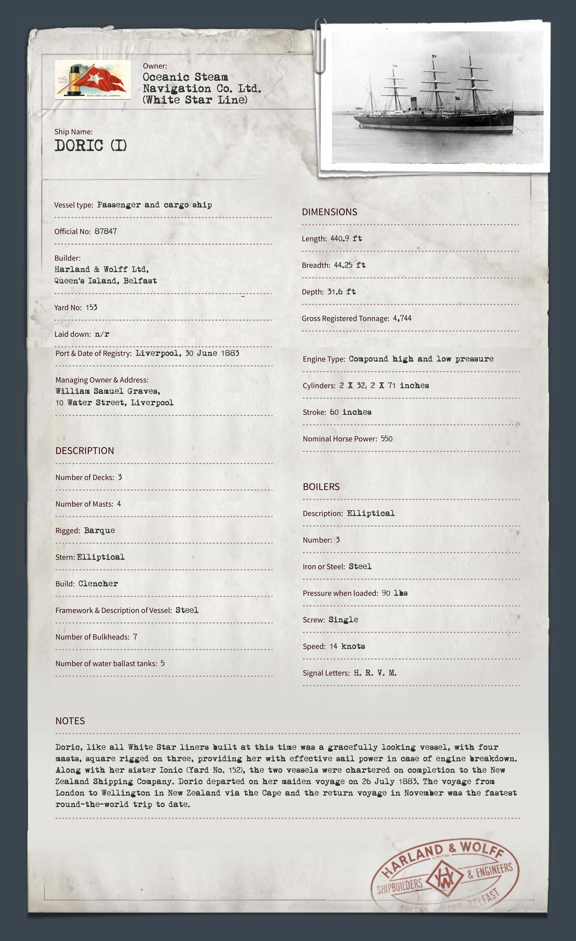 Doric, like all White Star liners built at this time was a gracefully looking vessel, with four masts, square rigged on three, providing her with effective sail power in case of engine breakdown. Along with her sister Ionic (Yard No. 152), the two vessels were chartered on completion to the New Zealand Shipping Company. Doric departed on her maiden voyage on 26 July 1883. The voyage from London to Wellington in New Zealand via the Cape and the return voyage in November was the fastest round-the-world trip to date.