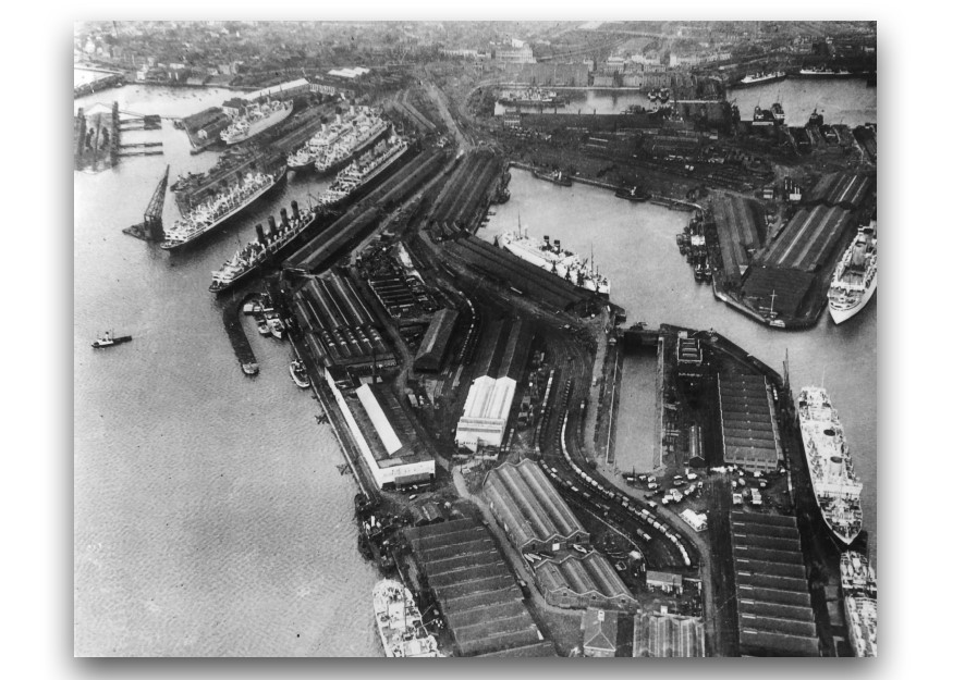 Right, Southampton — Britain’s premier passenger shipping port during the interwar years —photographed from a flying boat.